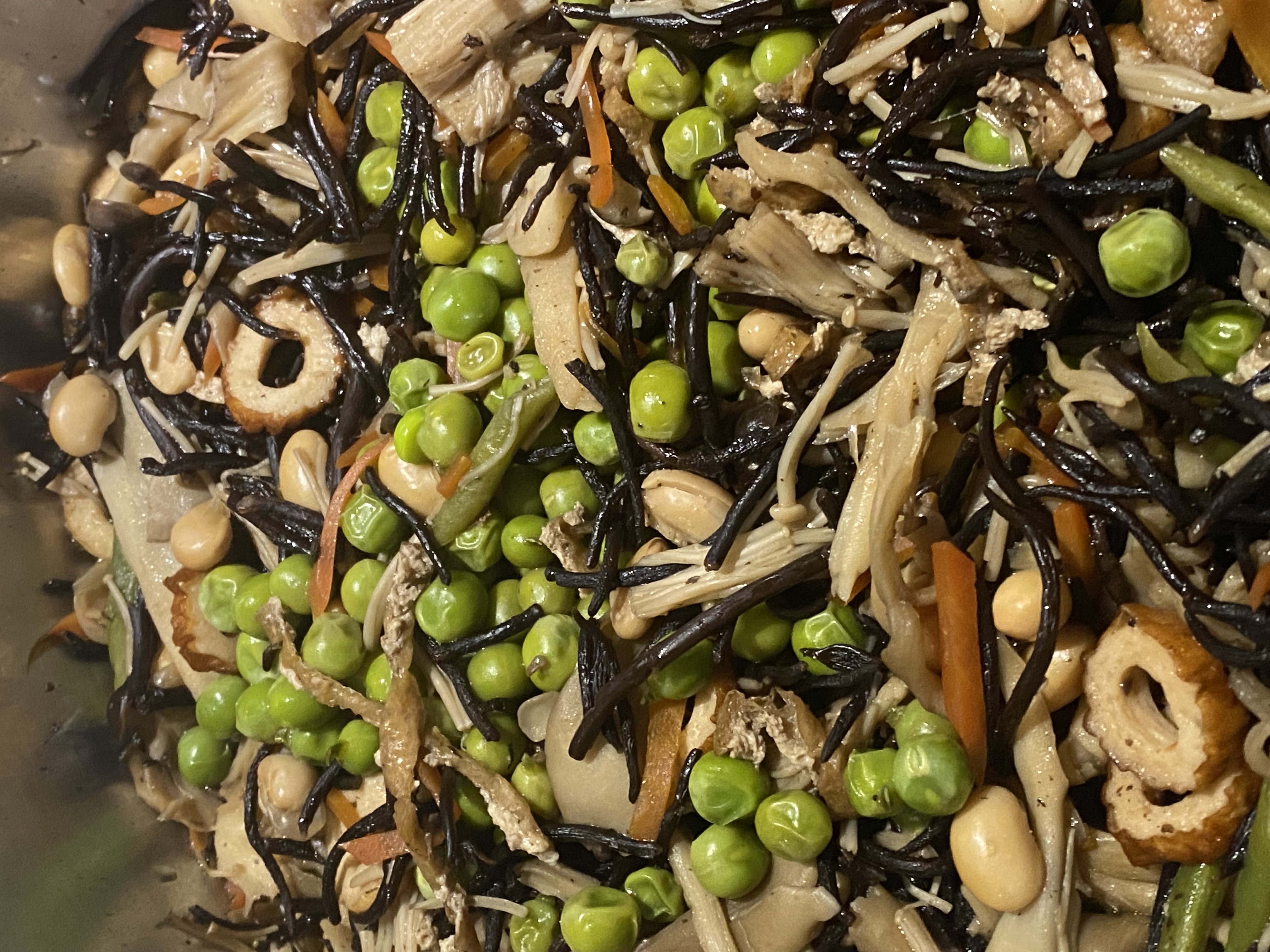 ひじき、人参、竹輪、舞茸、しめじ、えのき、いんげん、煮豆、いつもはこれだけですが今夜はグリンピースも入れました。